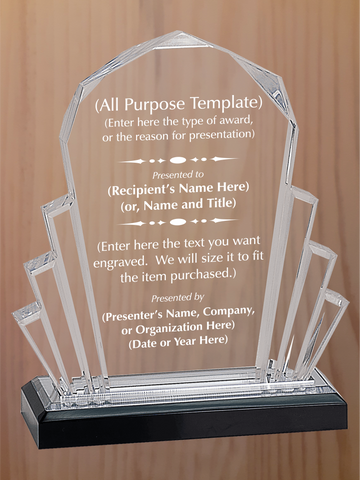 Impressive, multi section award features a tall center panel flanked by fanned pillars, on a black acrylic base with reflective colors in blue, gold or silver. Each color comes in two sizes, small is 8" tall, large is 9" tall. Engraving is included in price.