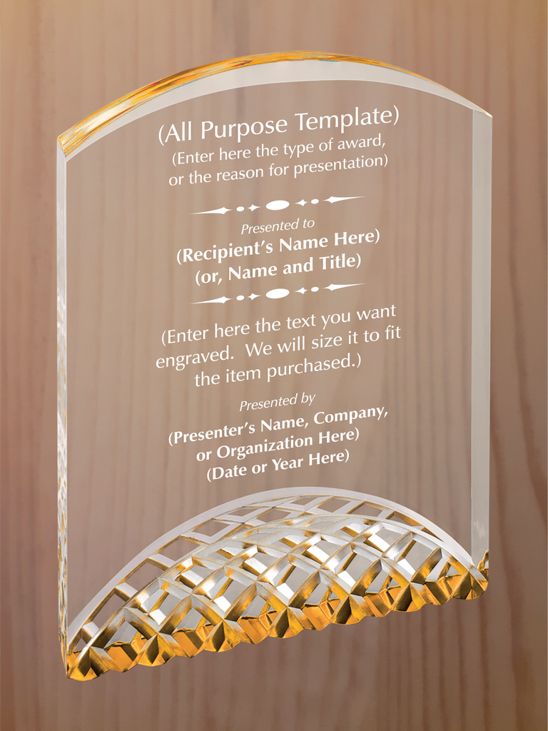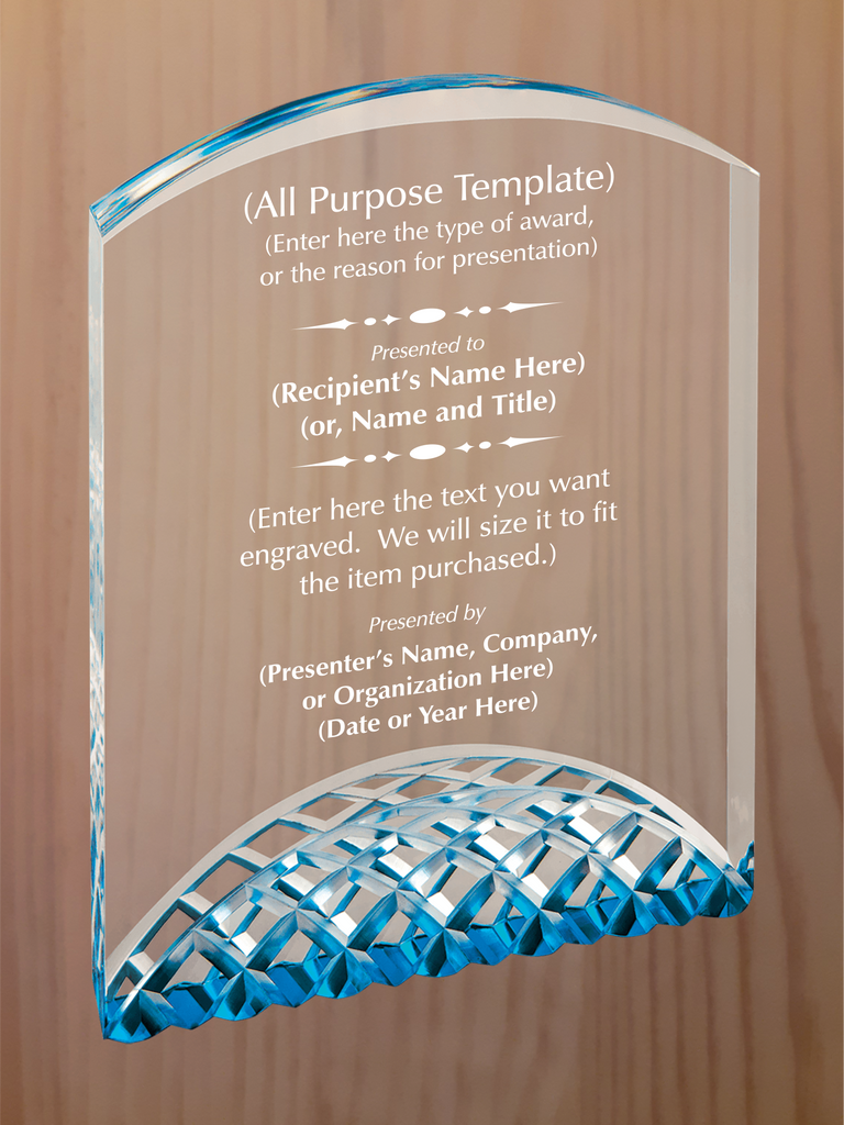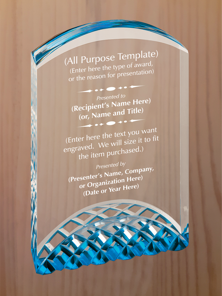 Arch top acrylic featuring carved arches on the bottom section, with reflective colors in blue, gold or silver. Each color comes in three sizes, small is 5" tall, medium is 6" tall, large is 7" tall.  Engraving is included in price.