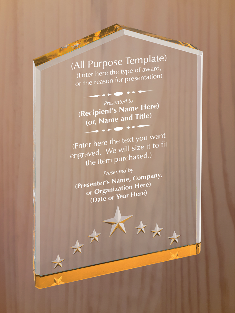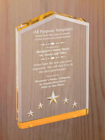 Peaked top acrylic featuring carved stars on the bottom section, with reflective colors in blue, gold or silver. Each color comes in three sizes, small is 5" tall, medium is 6" tall, large is 7" tall. Engraving is included in price.