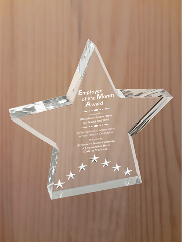 Star Performer, star shaped acrylic award featuring 7 carved stars and reflective colors in blue, gold or silver. Each color comes in two sizes, small is 5" tall, large is 6" tall.