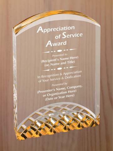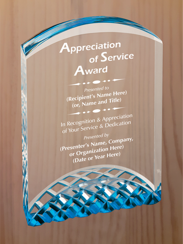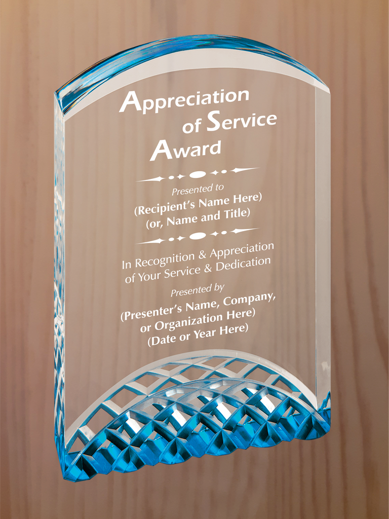 Arch top acrylic featuring carved arches on the bottom section, with reflective colors in blue, gold or silver. Each color comes in three sizes, small is 5" tall, medium is 6" tall, large is 7" tall.