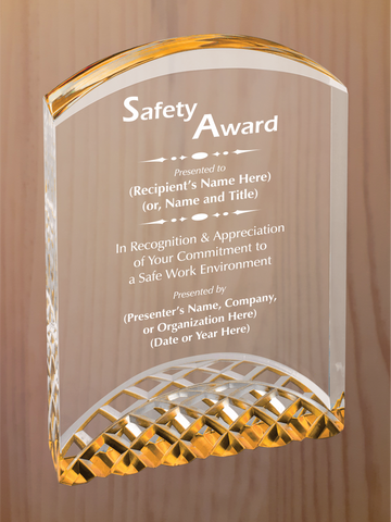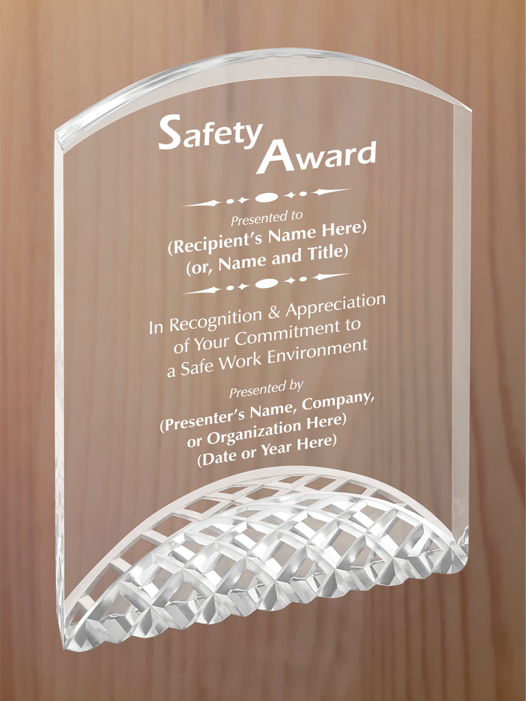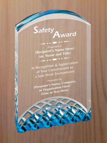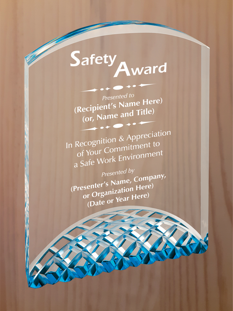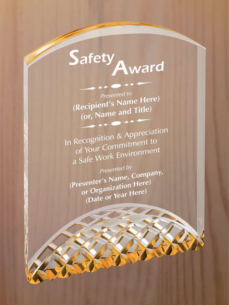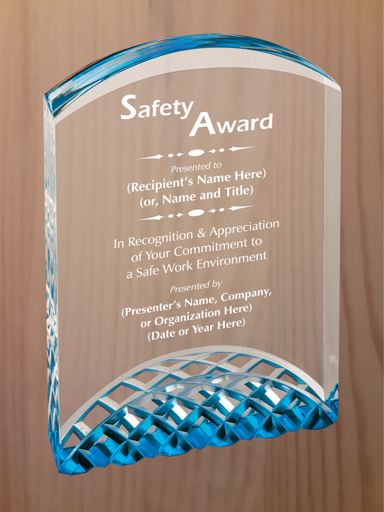Arch top acrylic featuring carved arches on the bottom section, with reflective colors in blue, gold or silver. Each color comes in three sizes, small is 5" tall, medium is 6" tall, large is 7" tall.