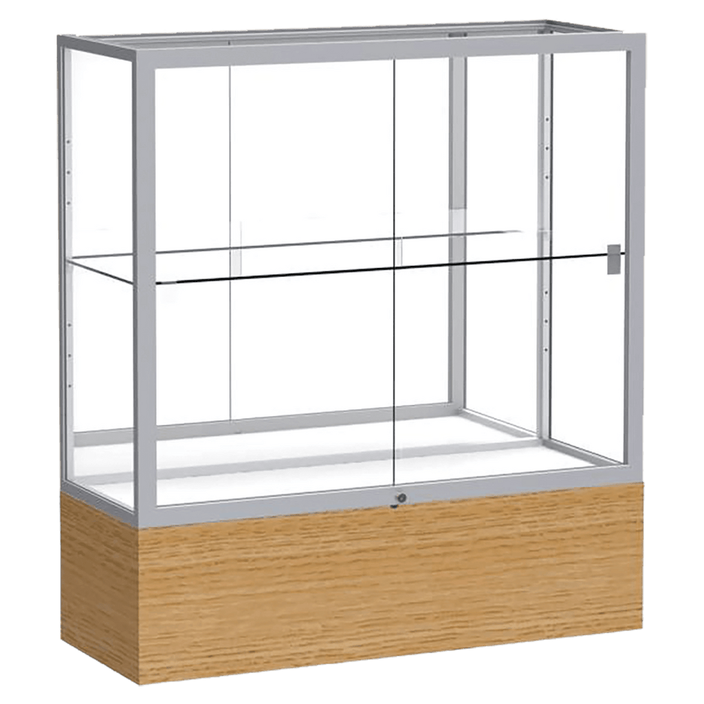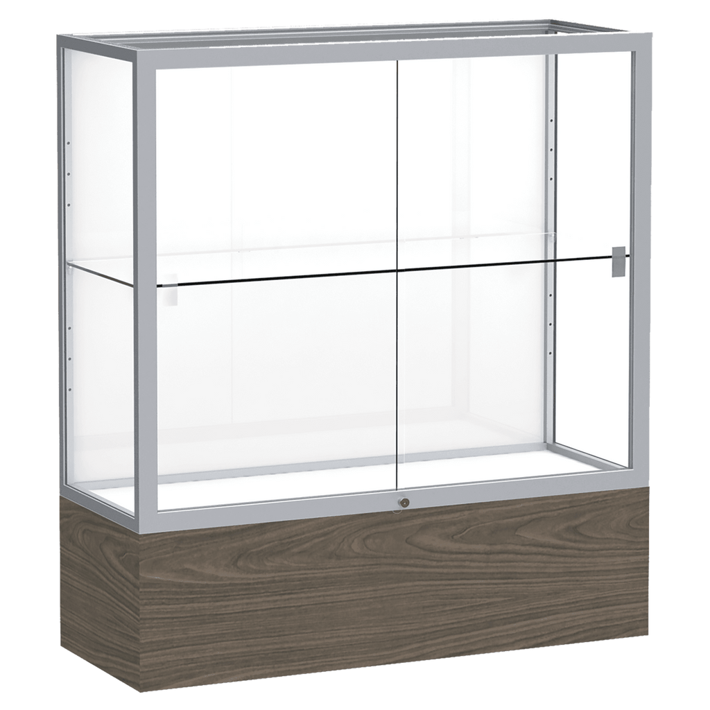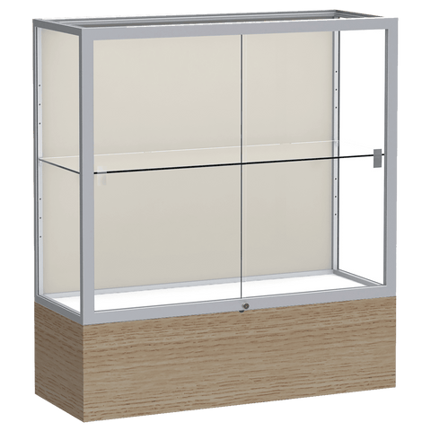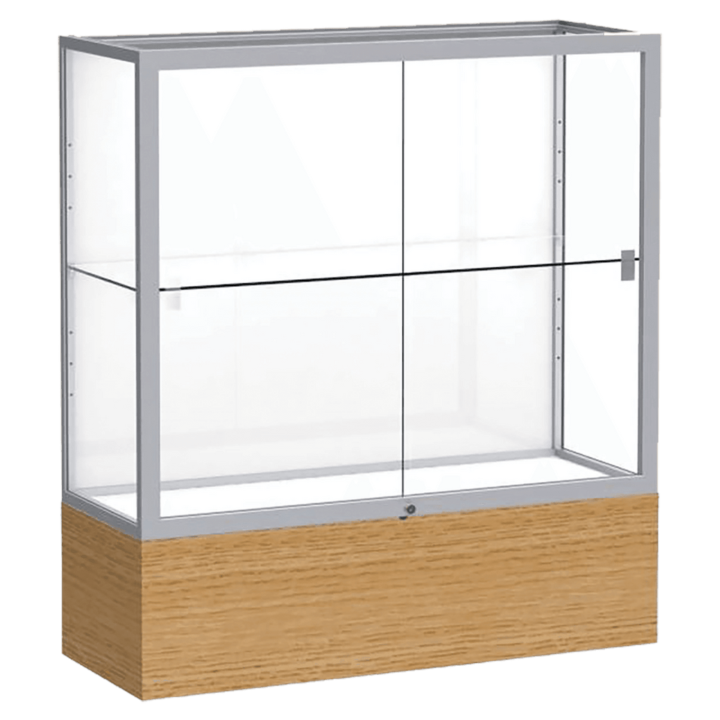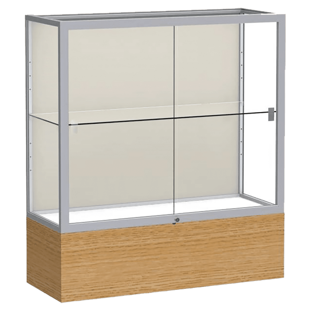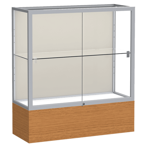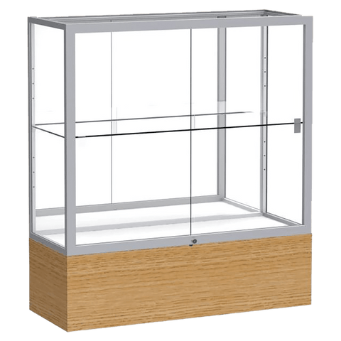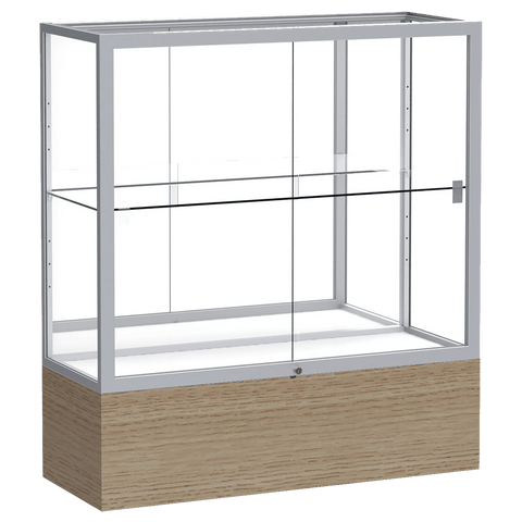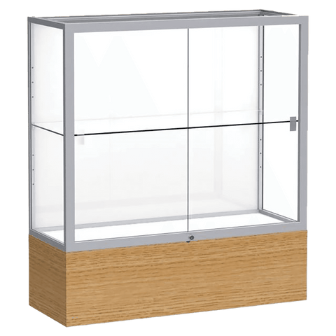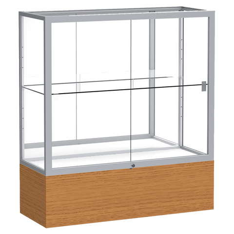 The Reliant Series combines the strength and durability of aluminum with either woodgrain vinyl or oak veneer. Anodized Satin Natural aluminum framing secures the sliding glass doors and incorporates a built-in lock. Steel shelving hardware and floor levelers are other standard features. Each 3ft wide case includes 1 full-length adjustable shelf. Comes in your choice of 4 woods/colors: Carmel Oak, Driftwood Oak, Natural Oak, and Walnut Woodgrain vinyl. You also have your choice of back side material: White, Fabric or Mirror. Display cases ship fully assembled. Size is 40" tall, 36" wide, 14" deep.