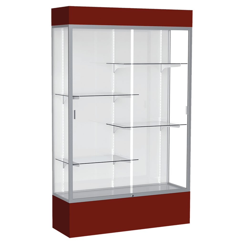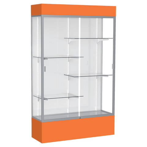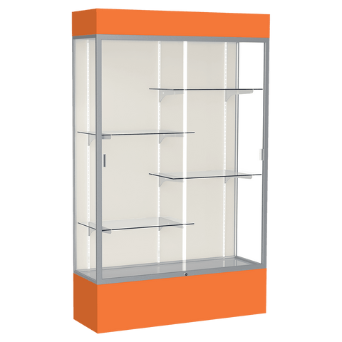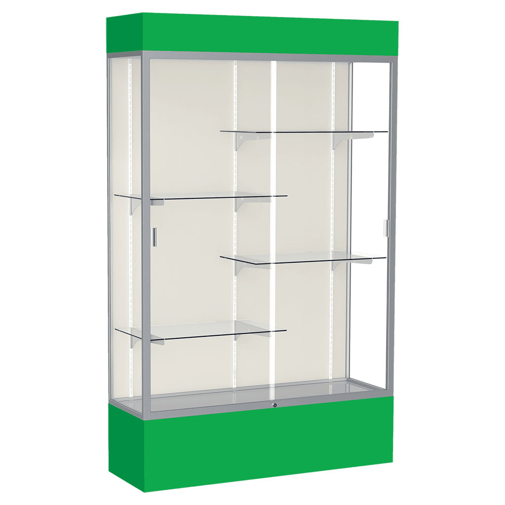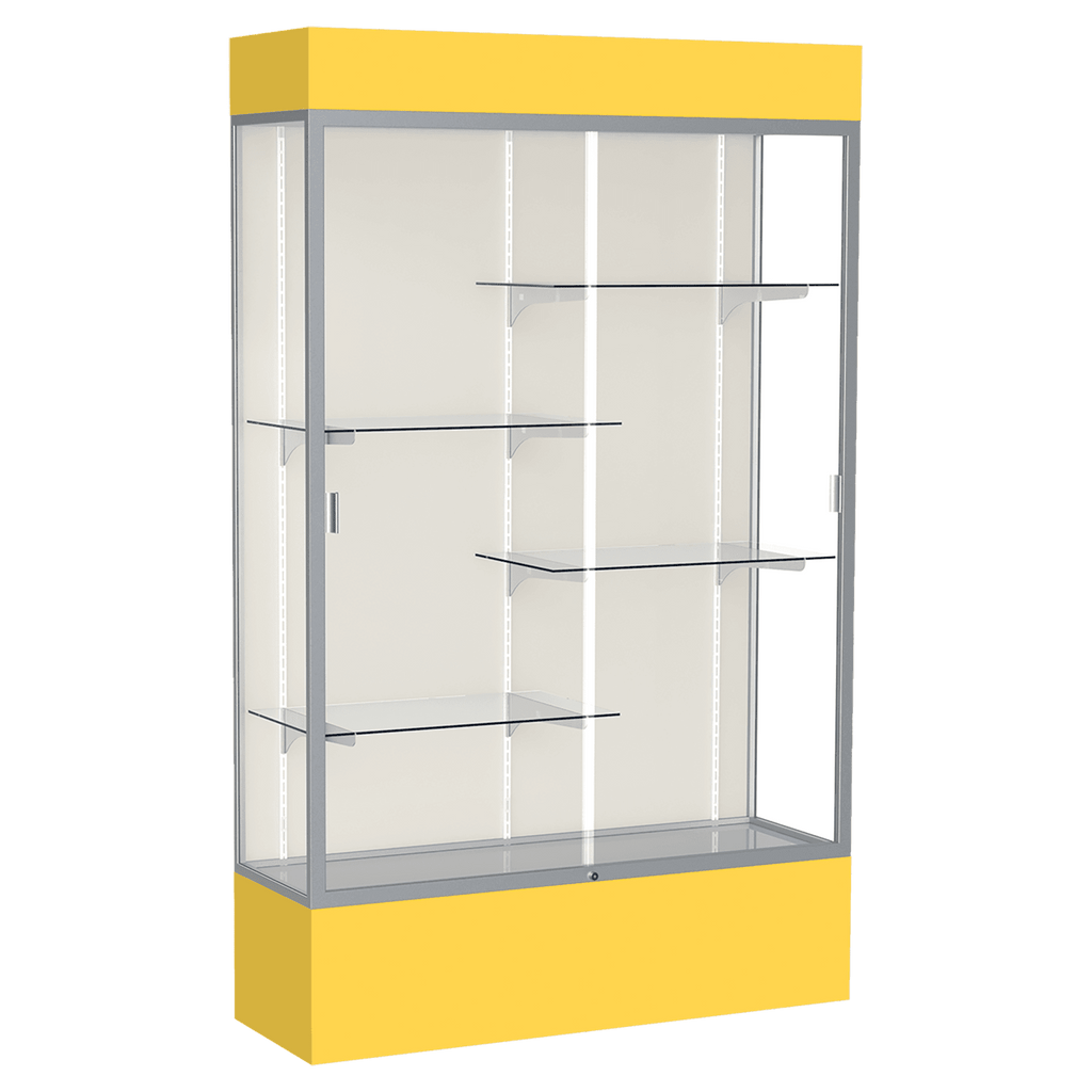 The Spirit Series Display Cases are specifically designed to coordinate with school colors and décor. Each case includes 4 half-length adjustable shelves. Comes in your choice of 9 different colors. A lighted top perfectly accentuates all achievements and tempered glass doors lock to secure the display case contents. Satin aluminum framing, steel shelving, and tempered glass creates a sturdy display. You also have your choice of back side material: White, Fabric or Mirror. Display cases ship fully assembled. Size is 80" tall, 48" wide, 16" deep.