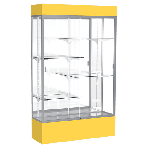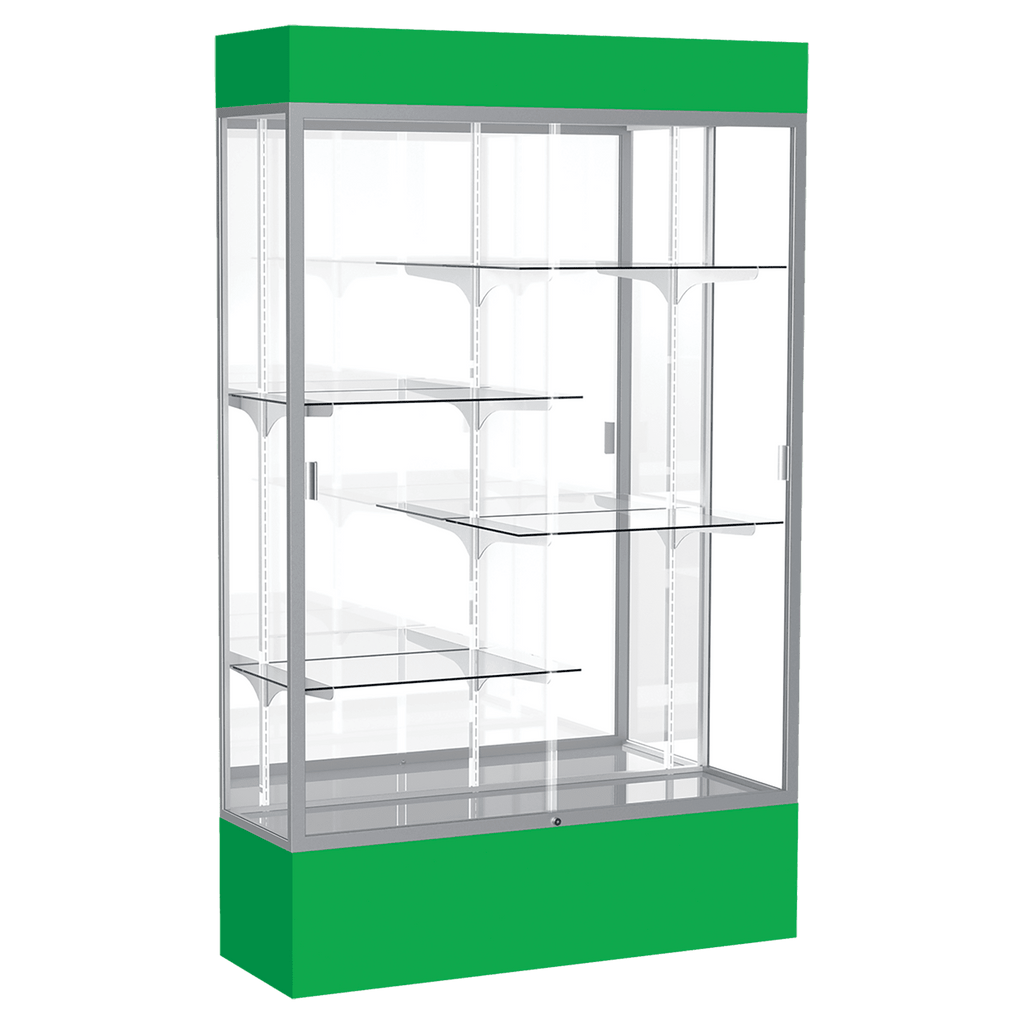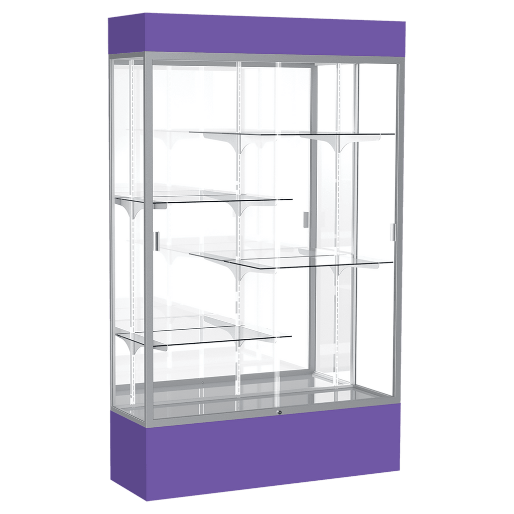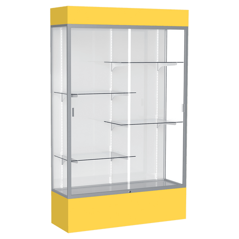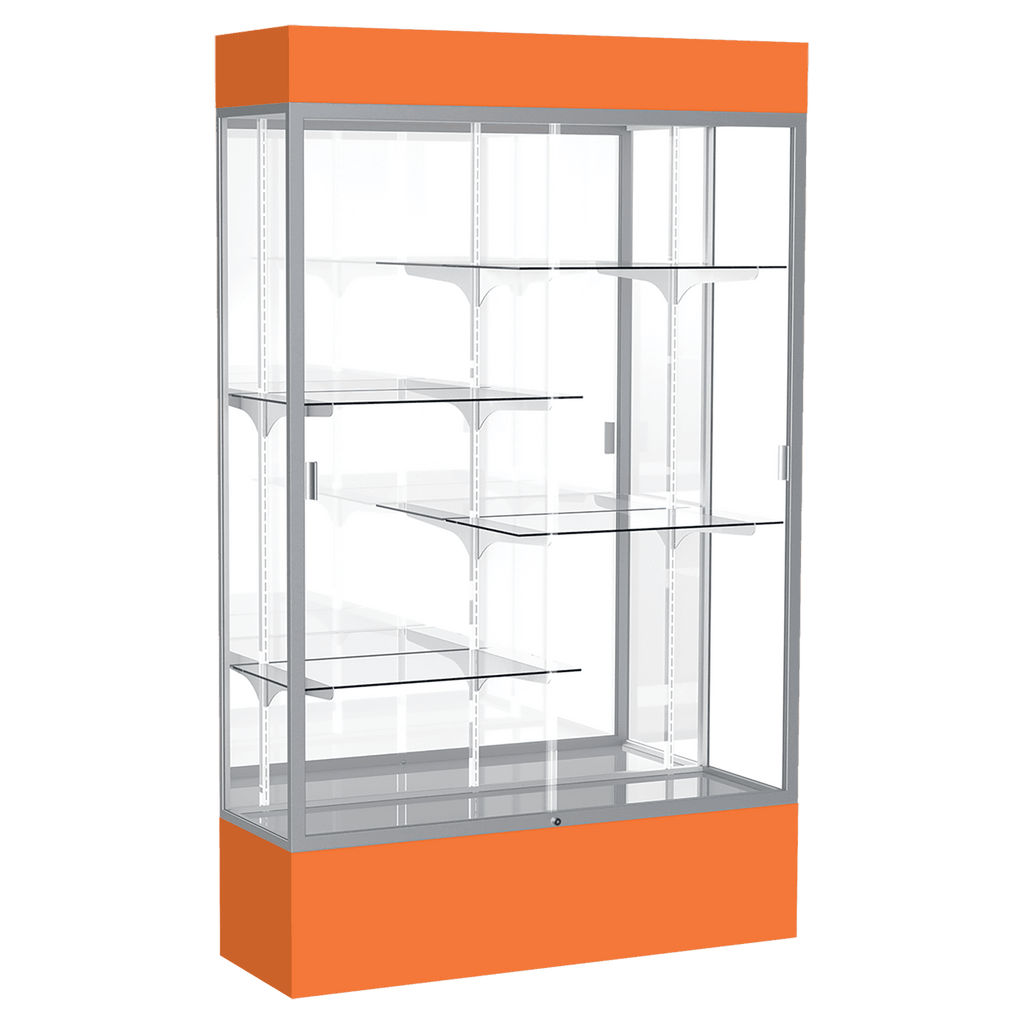The Spirit Series Display Cases are specifically designed to coordinate with school colors and décor. Each case includes 4 half-length adjustable shelves. Comes in your choice of 9 different colors. A lighted top perfectly accentuates all achievements and tempered glass doors lock to secure the display case contents. Satin aluminum framing, steel shelving, and tempered glass creates a sturdy display. You also have your choice of back side material: White, Fabric or Mirror. Display cases ship fully assembled. Size is 80" tall, 48" wide, 16" deep.