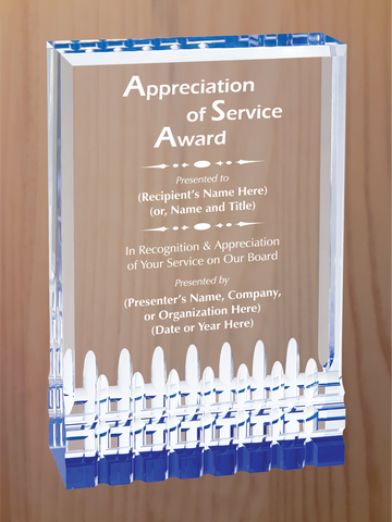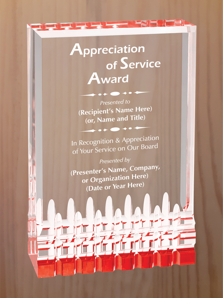 Rectangular self-standing acrylic with fluted bottom section and reflective colors in blue, gold, green or red. Each color comes in four sizes, 3.5"x5", 4.25"x6", 5"x7" and 6"x8".