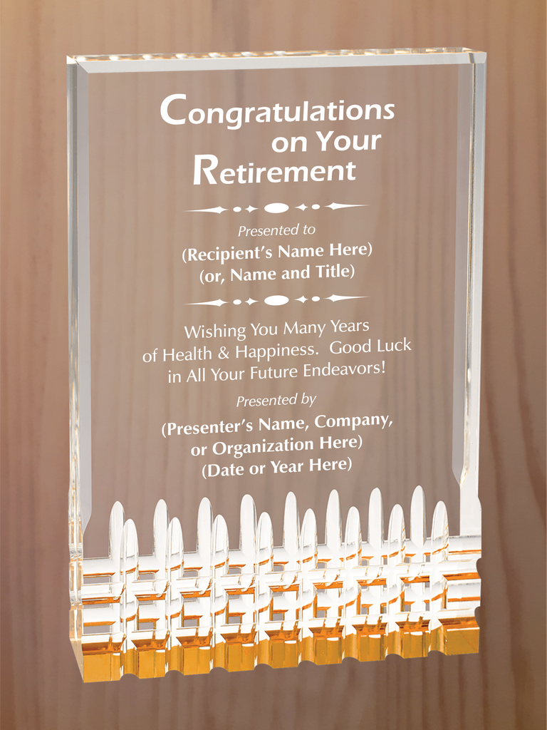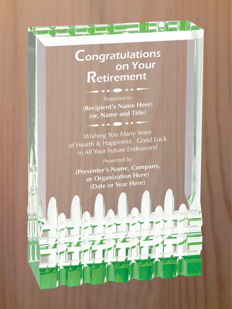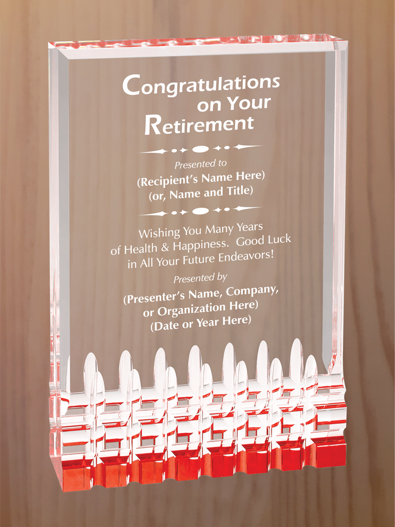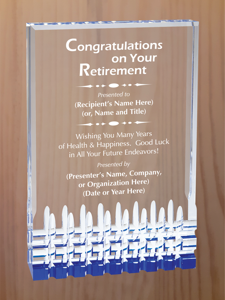 Rectangular self-standing acrylic with fluted bottom section and reflective colors in blue, gold, green or red. Each color comes in four sizes, 3.5"x5", 4.25"x6", 5"x7" and 6"x8".