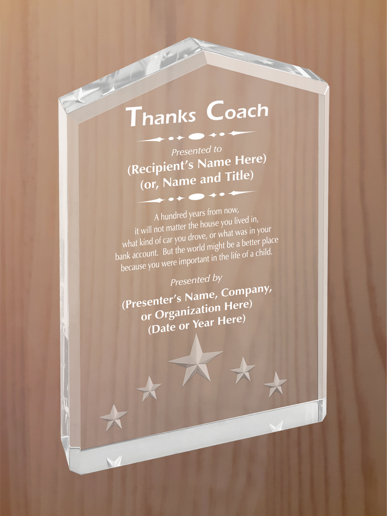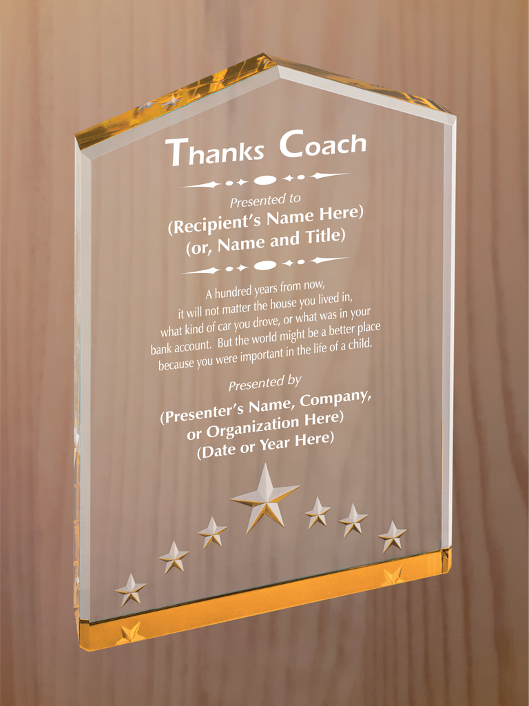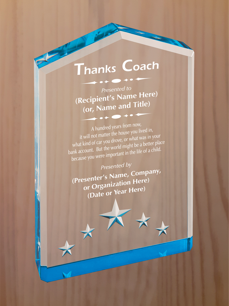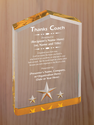 Peaked top acrylic featuring carved stars on the bottom section, with reflective colors in blue, gold or silver. Each color comes in three sizes, small is 5" tall, medium is 6" tall, large is 7" tall.